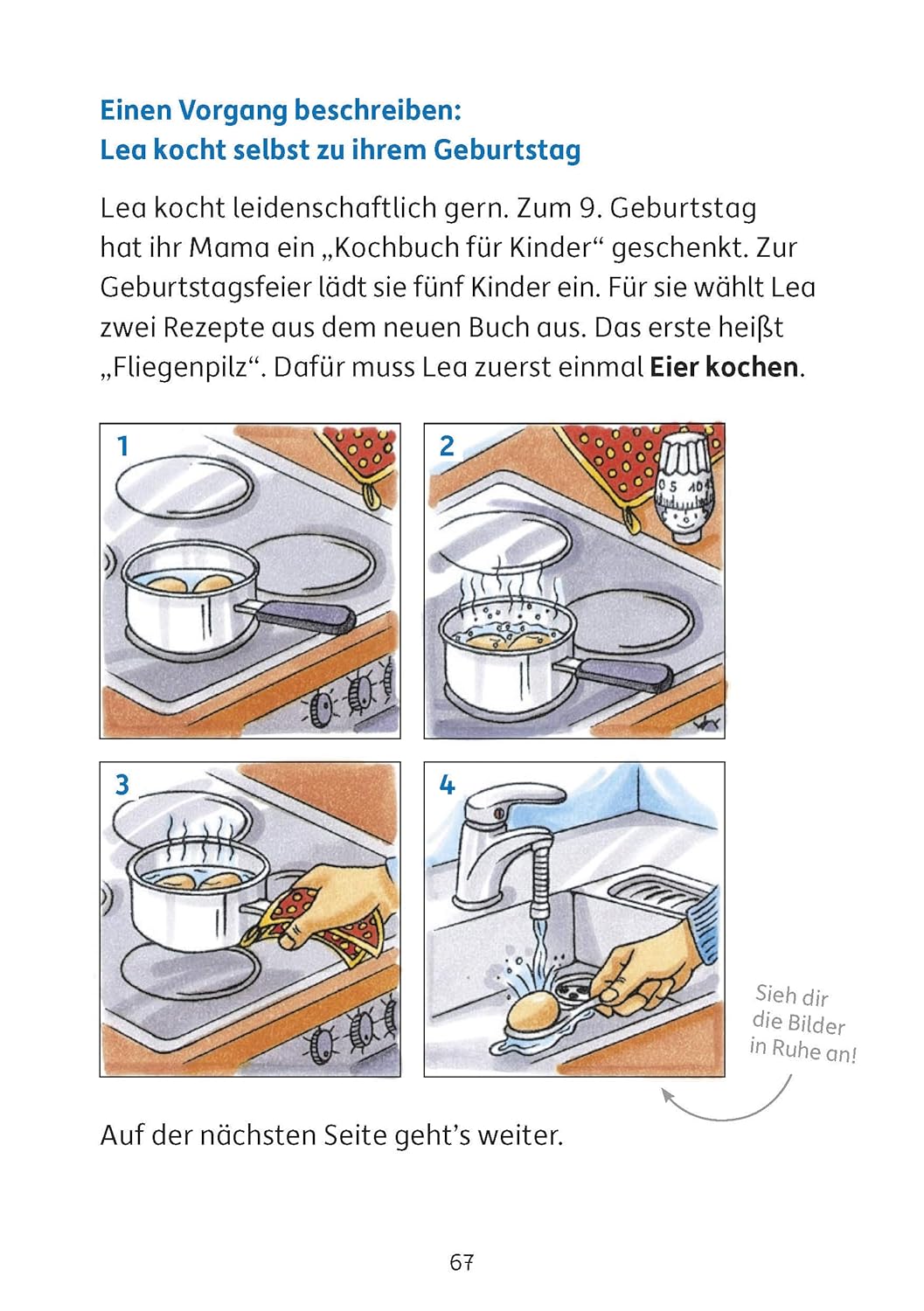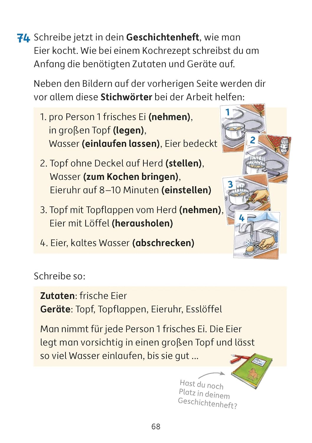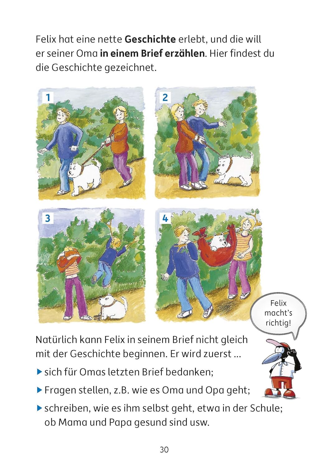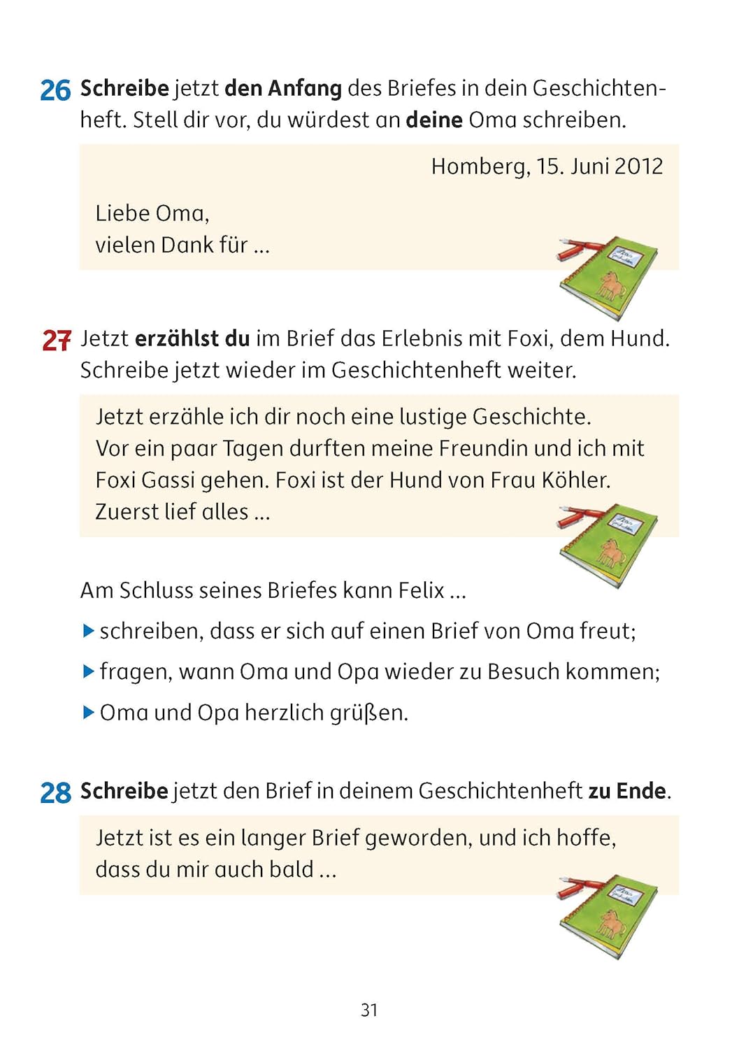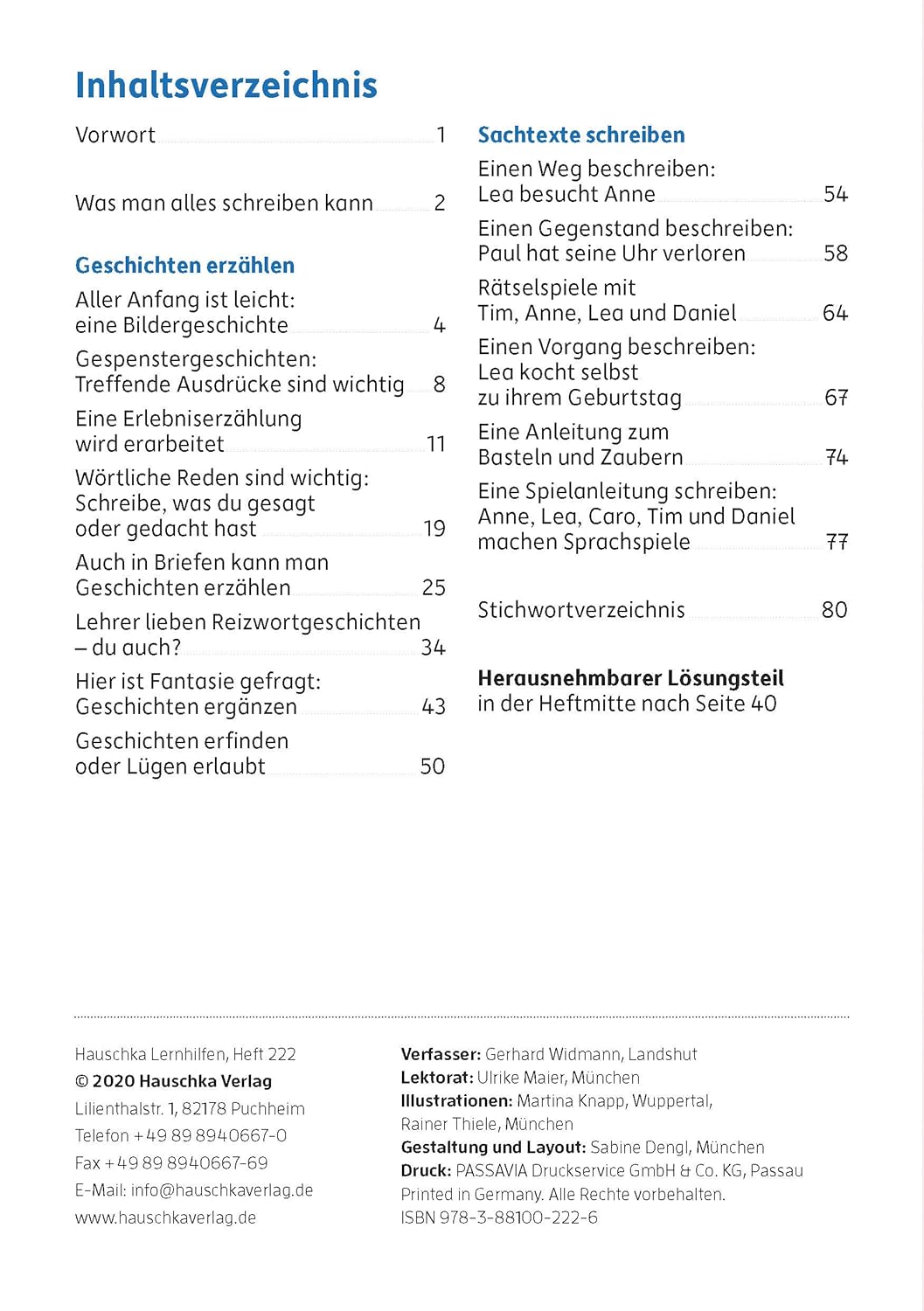 Schritt für Schritt lernen die Kinder mit viel Freude, wie man gute Aufsätze aufbaut. Sie üben sowohl spannend zu erzählen, die wörtliche Rede anzuwenden als auch das genaue Beschreiben von Gegenständen und Vorgängen. Begleitet und unterstützt werden die Kinder dabei vom Raben Lukas und der Bärin Lisa. Zahlreiche Musteraufsätze im herausnehmbaren Lösungsteil ermöglichen, die eigenen Texte zu vergleichen und einzuordnen Die Geschichten werden von den Kindern in ein selbstgestaltetes Geschichtenheft geschrieben. Motive zur Gestaltung befinden sich ebenfalls im Heft. So entsteht ein individueller Geschichtenschatz, den man sicherlich auch noch Jahre später gerne in die Hand nimmt.