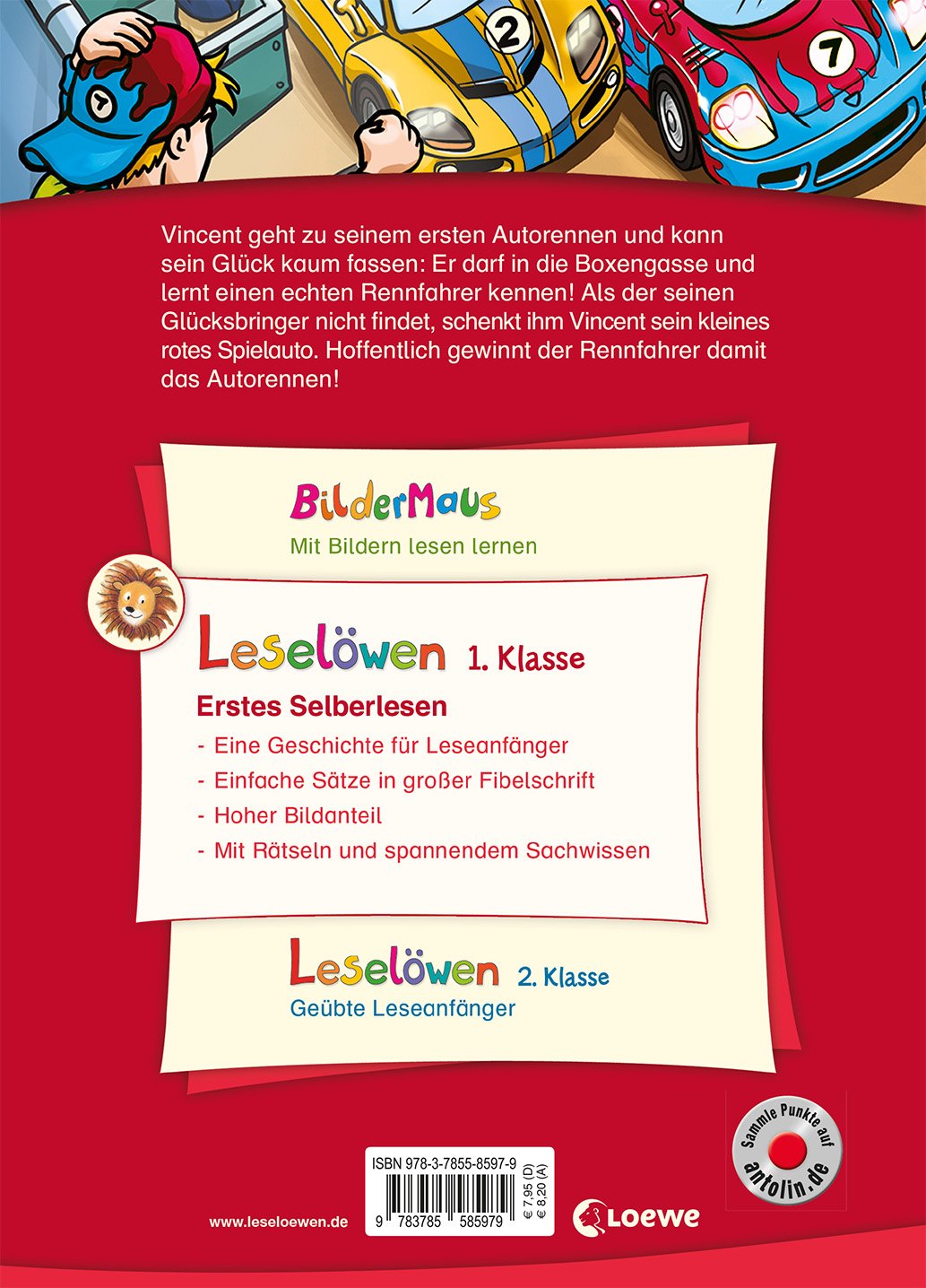 Vincent geht zu seinem ersten Autorennen und kann sein Glück kaum fassen: Er darf in die Boxengasse und lernt einen echten Rennfahrer kennen! Als der seinen Glücksbringer nicht findet, schenkt ihm Vincent sein kleines rotes Spielauto. Hoffentlich gewinnt der Rennfahrer damit das Autorennen! Lesenlernen ganz einfach – mit den Erstlesebüchern der Reihe Leselöwen für die 1. Klasse. Die Kinderbuch-Bestseller unterstützen mit vielen Extras das Textverständnis von Kindern ab 6 Jahren. Schenken Sie Ihrem Kind das bewährte Erfolgskonzept zum Lesenlernen. Für Alle, die schon als Kind unbedingt Rennfahrer werden wollen Seit über 45 Jahren lernen Kinder mit den Leselöwen erfolgreich lesen Über 29 Millionen verkaufte Exemplare Die Nr. 1 in Deutschland, Österreich und der Schweiz Spannende Erstlesebücher, unverzichtbar zum Lesenlernen mit Spaß Von Lehrern mitentwickelt und empfohlen, von Grundschülern getestet Einfache, kurze Sätze in großer Fibelschrift unterstützen optimal den LeselernProzess Genau auf die Interessen und Lesefähigkeiten von Grundschülern ausgerichtet Mit Frage und Übungsteil zur Förderung des Textverständnisses Inklusive spannendem “Schon gewusst”Sachwissen Abwechslungsreiche Quizfragen auf Antolin steigern die Lesemotivation